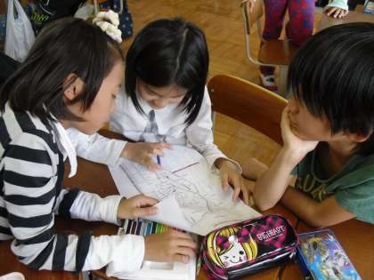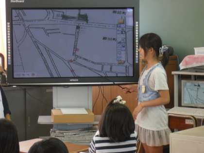 校区の危険なところや事故や事件をふせぐ工夫などグループで話し合い,地図にまとめました。話し合ったことをグループごとに報告しているところです。