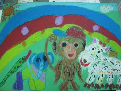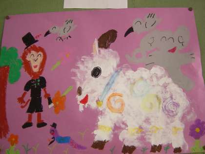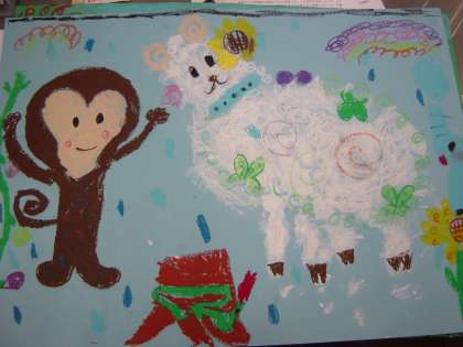 羊の体を絵の具でかきました。今回は手に直接白の絵の具をぬり,トントンとたたきながらフワフワの羊の体を表現しました。
