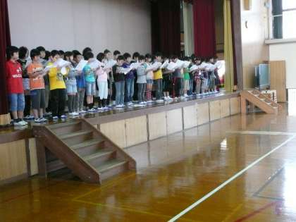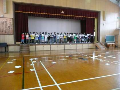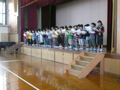 舞台にあがって「おまつり」の群読の練習をしています。
