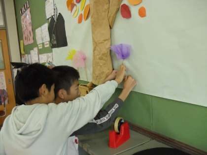 今日作った花を、後ろの掲示板に貼りました。2人で協力して貼りました。