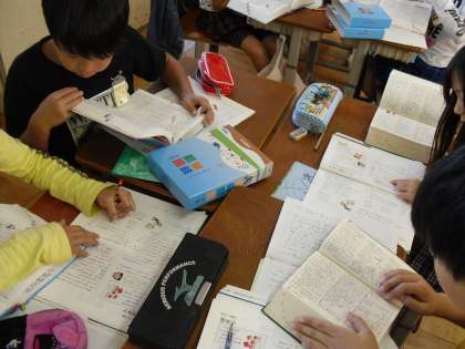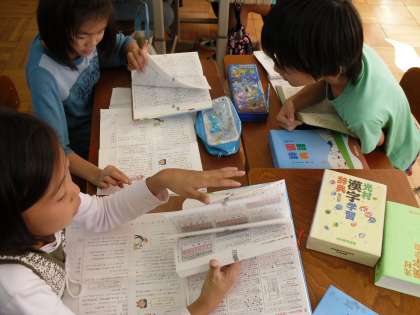 慣用句の学習をしました。「油を売るとはどんな意味だろう」「これはぼくが調べるよ」などグループで話し合い,分担しながら,国語辞典を使って,その使い方や意味を調べていました。