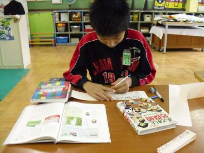 国語の時間に、本の背表紙作りに取り組みました。「まってました 名探偵」という本の背表紙を作っています。見た人が、思わず読みたくなるような背表紙を作りたいです。できたらまた報告します。