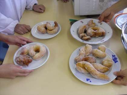 からっとあがったあげぱんに、グラニュー糖をまぶして、さあできあがり!とってもおいしそう。