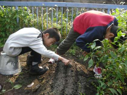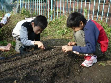 うねを完成させて、ほうれん草とはつか大根の種をまきました。芽が出てきたら、上手にまびきをします。はやく芽を出してね。