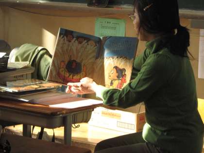 窓からは明るい朝日が差し込む教室で,絵本を片手にゆっくりと読んでくださるお話の中に,子どもたちはドンドンと引き込まれていきます。