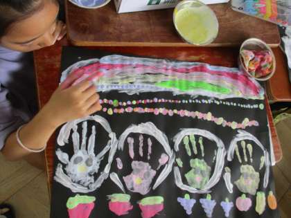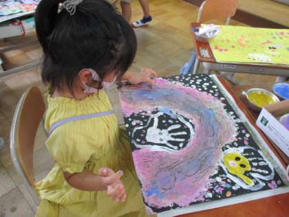 どろっとしていてとってもカラフルな絵の具に興味津々の子供たち。指で伸ばしたり、手のひらにつけて形を写してみたり、画用紙の上で色を混ぜて新しい色をつくったりと、絵の具の感触を楽しみながら、いろいろ試して工夫して活動していました。