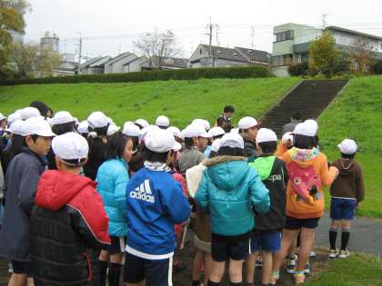朝から雨模様で,試走できるか心配しましたが,雨がやんだすきに行くことになりました。太陽が出ていないので,ちょっと肌寒い感じでしたが,5〜6年生にまじって4年生はやる気満々です。河川敷の木の葉もきれいに紅葉していました。