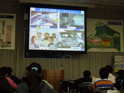 ダイハツという社名になったあらましや,ダイハツ工場での仕事などについてビデオを見たり,お話を聞いたりして教えてもらいました。