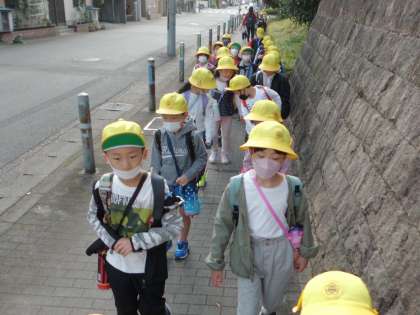 天気にも恵まれ、西京極総合運動公園へ秋みつけに行きました。初めての校外活動で、子供たちはとても楽しみにしていました。ワクワクしている中でしたが、前を向いて間があかないように、広がりすぎないように出発前の約束をしっかりと守って歩くことができていました。西京極総合運動公園では、たくさんのどんぐりを拾うことができ大喜びでした。夢中で探しているとたくさんのくっつき虫がついてしまった子もいました。