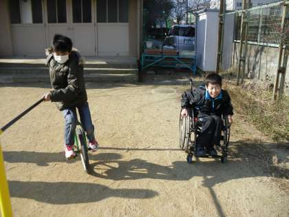 友達の一輪車と、どちらが速いか競争だ!むこうのゴールで待っている、先生のところに早く着くのは・・・、さあ、勝負だ!