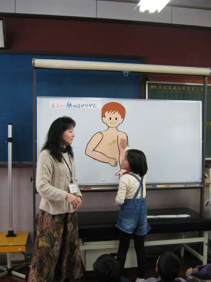 2年生は,熱の正しい測り方についてです。体温計で熱を測るときは,体温計のはさむ角度が大切です。正しく測るためにも,体温計は下から上向きにはさむようにしてください。