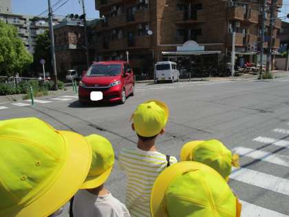 生活科の学習で町探検へ行きました。学校の登下校で通る道でも、今までは気付かなかったお店や看板などを見付け、「こんな所にお店があったんだ。」と子供たちも楽しそうでした。