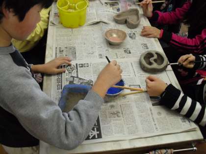 焼き物作りのお皿が乾いたので,絵付け(色つけ)をしました。