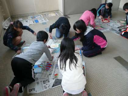 電動のこぎりで切ったあとは,絵の具で色をつけました。