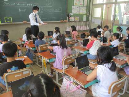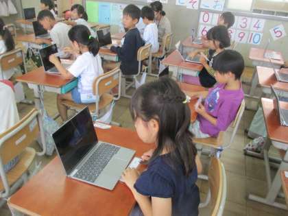 1年生になって初めてGIGA端末を使いました。電源を入れ、自分のIDやアドレスを入力しました。画面が立ち上がると、大喜びの子供たちでした。