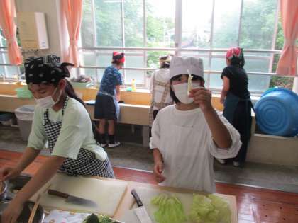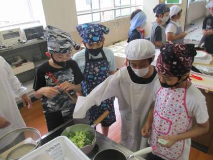 家庭科の時間に調理実習をしました。3つの野菜を切ったりゆでたり、各グループで役割分担をして頑張りました。どの子供も真剣な表情です。