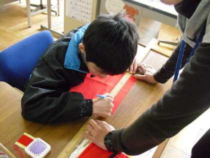 今日は、エプロンのポケットを縫い付ける作業をしました。まず、布にチャコペンで縫う線をひいていきました。