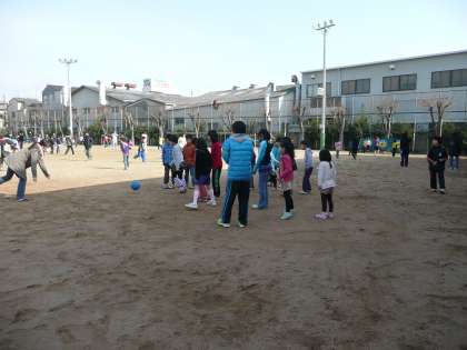 運動場が少しぬかるんでいましたが,そこをさけての「ころがしドッジ」