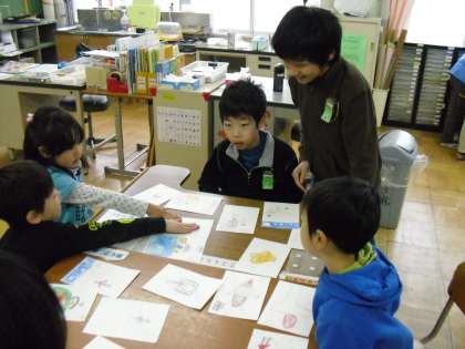 今日から、1年生とかるたで一緒に遊んでいきたいと思います。このかるたは、1年生が作ったものです。どれも、とても上手にできていました。まず、今日は3人の1年生のおともだちがきてくれました。