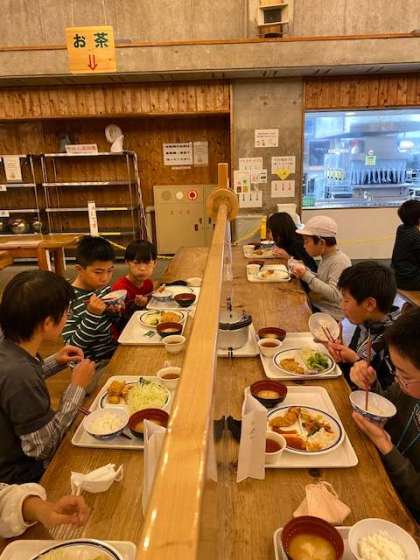 入浴の後、夕食は白身魚フライに揚げ餃子、たこ焼きなどボリューム満点です。この後、キャンプファイヤーです。今日はここまでです