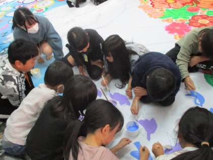 今日の午後は、世界平和を願った「キッズゲルニカ」の活動を行いました。迫力ある大きな場所に絵を描けることに子供たちはわくわくした様子でした。4年生は、平和の象徴である「鳥」を描きました。