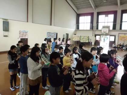 「6年生にみんなの気持ちが伝わるように,心をこめて演奏しよう。」と水谷先生からの言葉をいただいて,ぎこちないながらも体をゆすって楽しい表情で演奏していました。