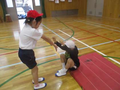 体育科では、「マットあそび」の学習をしています。マット遊びの行い方を知り、いろいろな方向へ転がったり、手や背中で支えて逆立ちをしたり、前転がりや後ろ転がりをしたりしています。場作りや後片付けも、自分たちで協力して行っています。