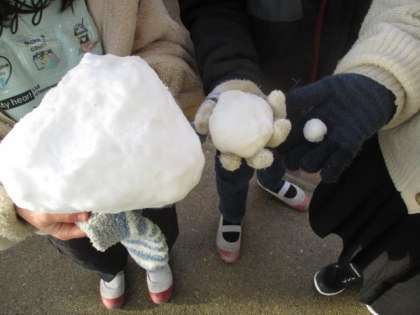 朝、門で子供たちを出迎えていると、次々に雪を集めて嬉しそうに見せにきてくれました。