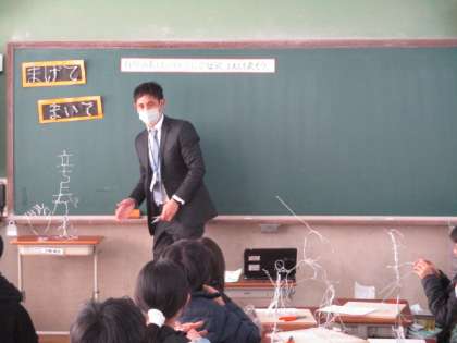 5年生は針金の特徴を生かして自分の表したいことを次第に思い付いて表していました。細い針金の形が変わると大きな空間が感じられる立体になるのです。子供たちはいろいろな方向から見ながらつくり変えていました。