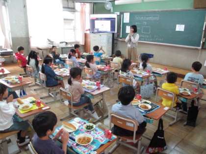 今日は1年生にとって初めての給食でした。メニューはスパゲティのミートソースに、ほうれん草のソテー、コッペパン、りんごゼリーです。わくわくしながら手を合わせて、「いただきます」とあいさつをしました。たのしく、おいしく食べていました。