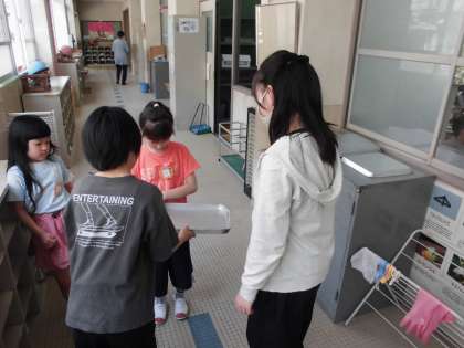 最高学年として、1年生の給食片付けと、そうじのお手伝いに行っています。おぼんの片付け方や箒での掃き方など、1年生にやさしく伝えていきます。