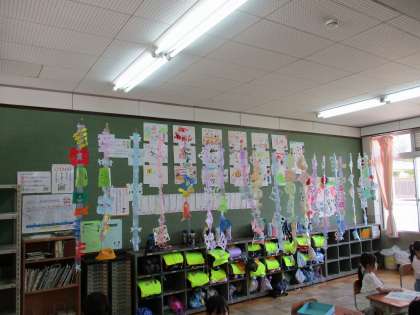 1年生の教室の中に、図工で作った『ちょきちょきかざり』を飾っています。折り方と切り方を工夫して取り組みました。