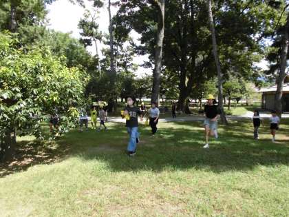 昼食は京都御苑の休憩所でお弁当を食べました。暑さで疲れているかと思いきや・・・。昼食後の空き時間、元気に走り回る子供たちです。昼食後は二条城へ。快晴の空のもと、歴史を感じられました。