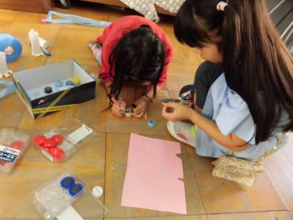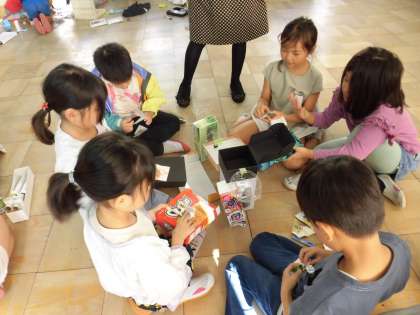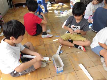 2年生では生活科で「あそんで ためして くふうして」の学習で、廃材を使ったおもちゃづくりに取り組んでいます。材料をどのように使うとよいかを考えたり、ゴムや磁石などを用いた遊びを作ったりしています。試行錯誤しながら、それぞれの気付きをいかした遊びを作っている子供たち。どんな遊びが完成するか、楽しみです。
