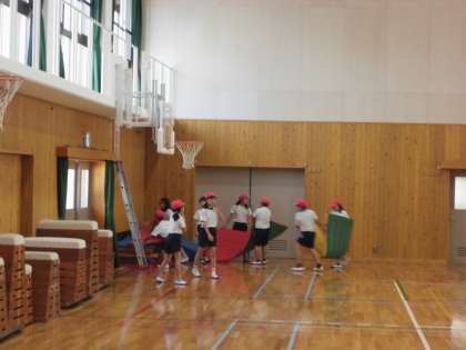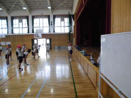 準備体操リーダーを中心に、マット運動に適した準備運動をしています。