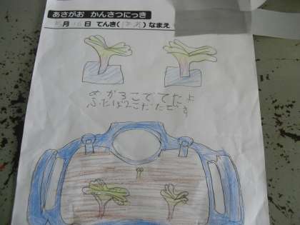 ふたばのかんさつをしました。ふたばの様子をしっかり見て絵や文に表しました。大きくなってほしい気持ちも書いていました。