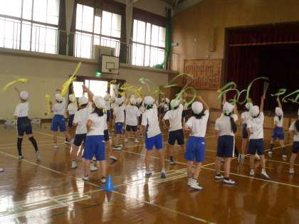 団体競技は3年生と一緒に「タイフーン」をします。競技の前には,リボンの踊りもします。だんだんうまく踊れるようになってきました。