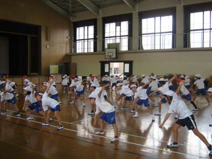 3年生といっしょに団体演技の練習を始めました。残暑厳しい体育館で、ダンスの練習をしています。