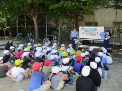 5月28日に自転車教室がありました。西京極西小学校PTA、学校運営協議会、西京極交通安全推進会の皆様にお世話になり、正しく安全な自転車の乗り方についての学習をしました。自転車に乗る時のきまりや標識などについて右京警察署の方々に丁寧にご指導いただいた後、実際に自転車に乗って走行しました。子供たちは一時停止や左側通行などのきまりを守り、安全に気を付けて自転車に乗っていました。ご協力いただいた皆様、ご多忙のところありがとうございました。