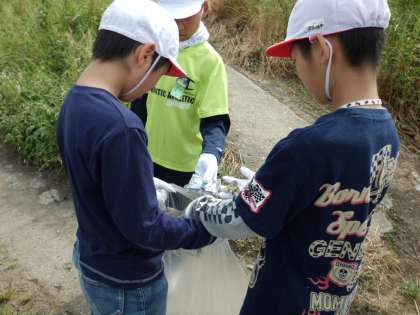6年生は4・5年生と一緒に桂川の河川敷のごみ拾いをしました。
