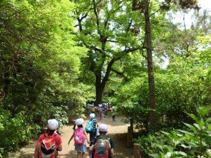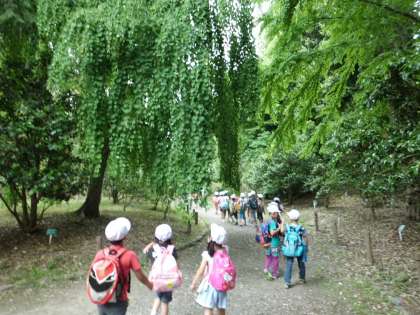 子どもたちはは校庭や街路樹には慣れ親しんでいますが,さすがに普段は見たこともないような珍しい大木に遭遇したり,「水琴窟」の奏でる優しい音色にも親しみました。