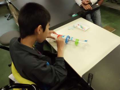 工作コーナーで、「エコーマイク」を作りました。自分の話し声がエコーがかかったみたいで、とてもおもしろかったです。