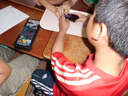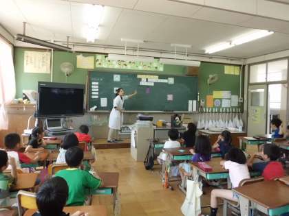 なすの色や形をみんなで話し合って,そのあとは,班ごとに実物を『手』『目』『鼻』で観察しました。輪切りにしたナスも触ったりにおいをかいだりして,いろんな発見をしました。