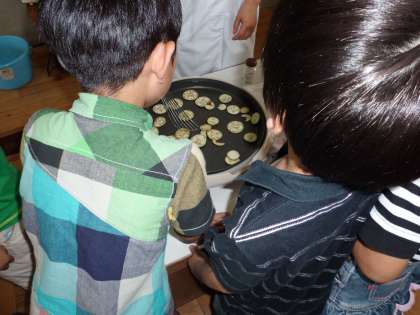 うすく輪切りにしたナスをホットプレートで素焼きして,うすく塩で味をつけたものを試食しました。その際,耳をふさぎながら食べることで『音』も聞きました。