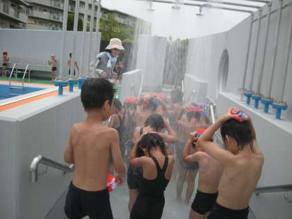 シャワーにかかるのも冷たくて気持ちいいです。かえるの歌をグループで歌ってシャワーにかかります。