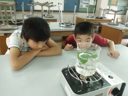 ジャガイモの葉っぱを、お湯でやわらかくして、ろしにはさんでたたきます。でんぷんがあるかないかを、調べるための実験です。