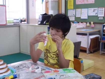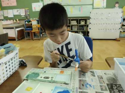 図工の時間に、気球に乗ろうを学習しました。気球に乗る人を、紙粘土で作り、色付けしています。