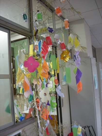 3組さんに習ったちょうちんやいろんなかざりをみんなでかざりました。七夕かざりでは,一人ひとりねがいを込めて短冊に大きくなったらなりたいことなどを書いている子どもが多かったです。