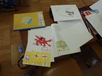 教科書の挿絵(はじめと終わりの2枚があります)を使って,自分でストーリーを組み立てていきます。