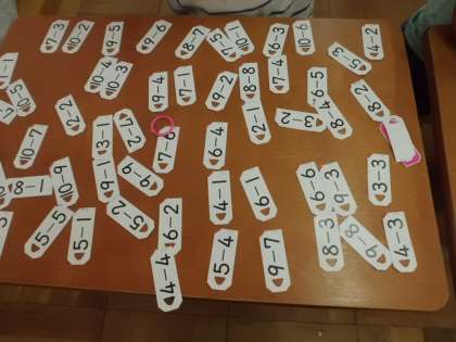 ひきざんカードでけいさんれんしゅうをしています。はじめは,順番にしていましたが慣れてくるとバラバラにしていろんな計算を早く正確に出来るように練習しています。